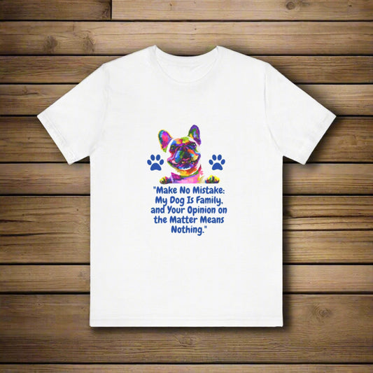 "MAKE NO MISTAKE MY DOG IS FAMILY AN YOUR OPINION ON THE MATTER MEANS NOTHING" Unisex Jersey Short Sleeve Tshirt by SniffWaggle'n'Walk™Regular price From £19.27 GBPRegular priceUnit price / per-