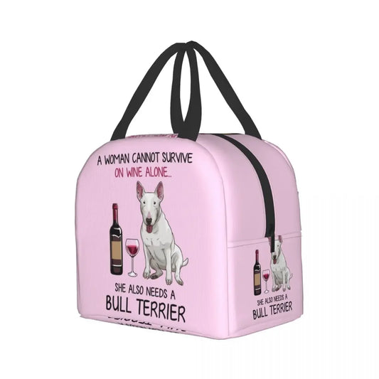 SniffWaggleNWalk™️! Bull Terrier And Wine Funny Dog Insulated Lunch Bag.