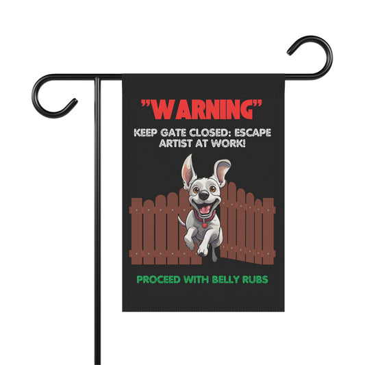 "Warning: Keep Gate Closed - Escape Artist at Work, Proceed with Belly Rubs" Funny Garden Sign – Durable & Weather-Resistant Dog Banner