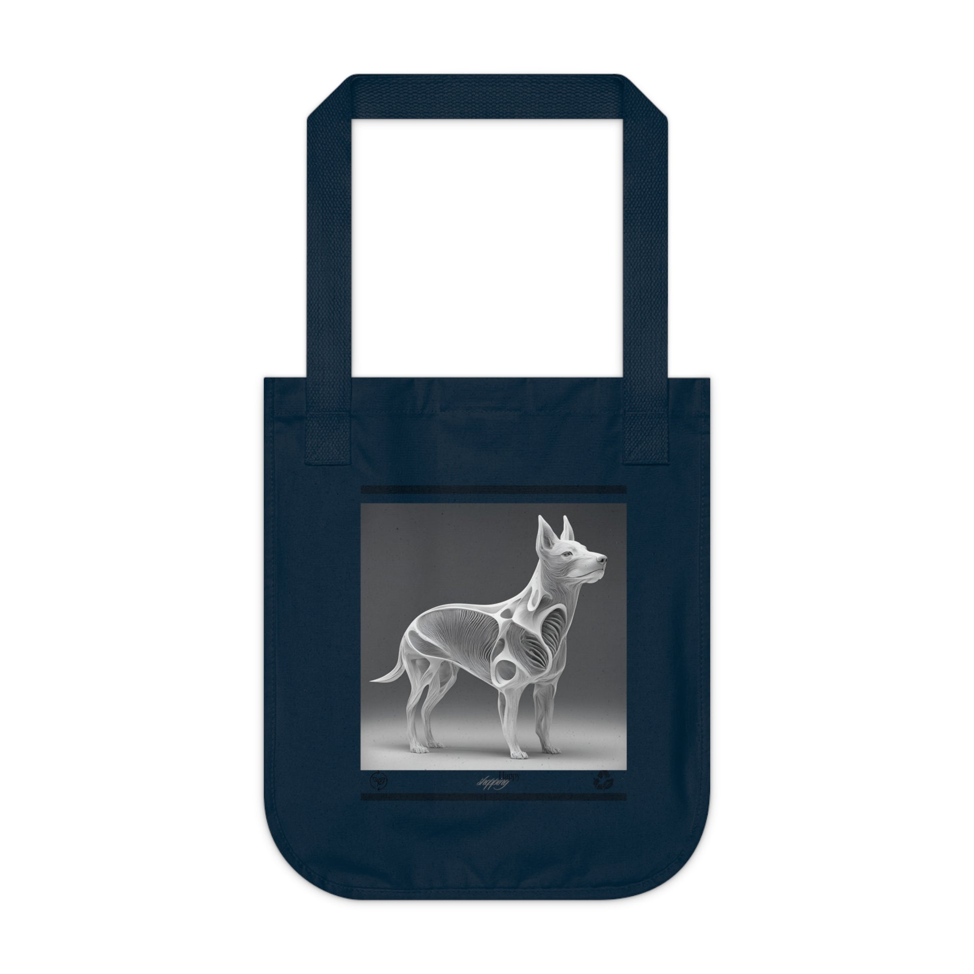 A happy shopping eco dog design tote bag made from 100% Certified Organic Cotton. This medium heavy fabric bag with cotton web handles is spacious and comfortable to carry, perfect for environmentally conscious shoppers. Ideal for dog lovers looking for a sustainable and practical tote bag for everyday use or grocery shopping.