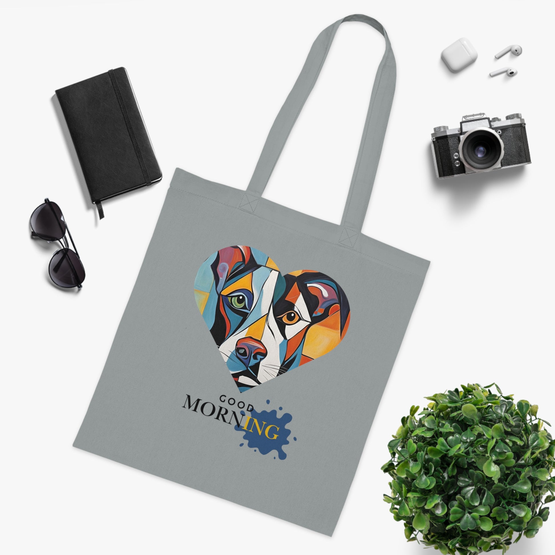 A versatile cotton tote bag featuring an abstract dog design inside a heart, with 'good morning' written underneath. This tote is perfect for animal lovers and those who appreciate a touch of creativity in their daily accessories. Ideal for carrying groceries, books, and everyday essentials. Great for dog lovers and art enthusiasts alike. Perfect for gifting on birthdays, Valentine's Day, or any occasion.
