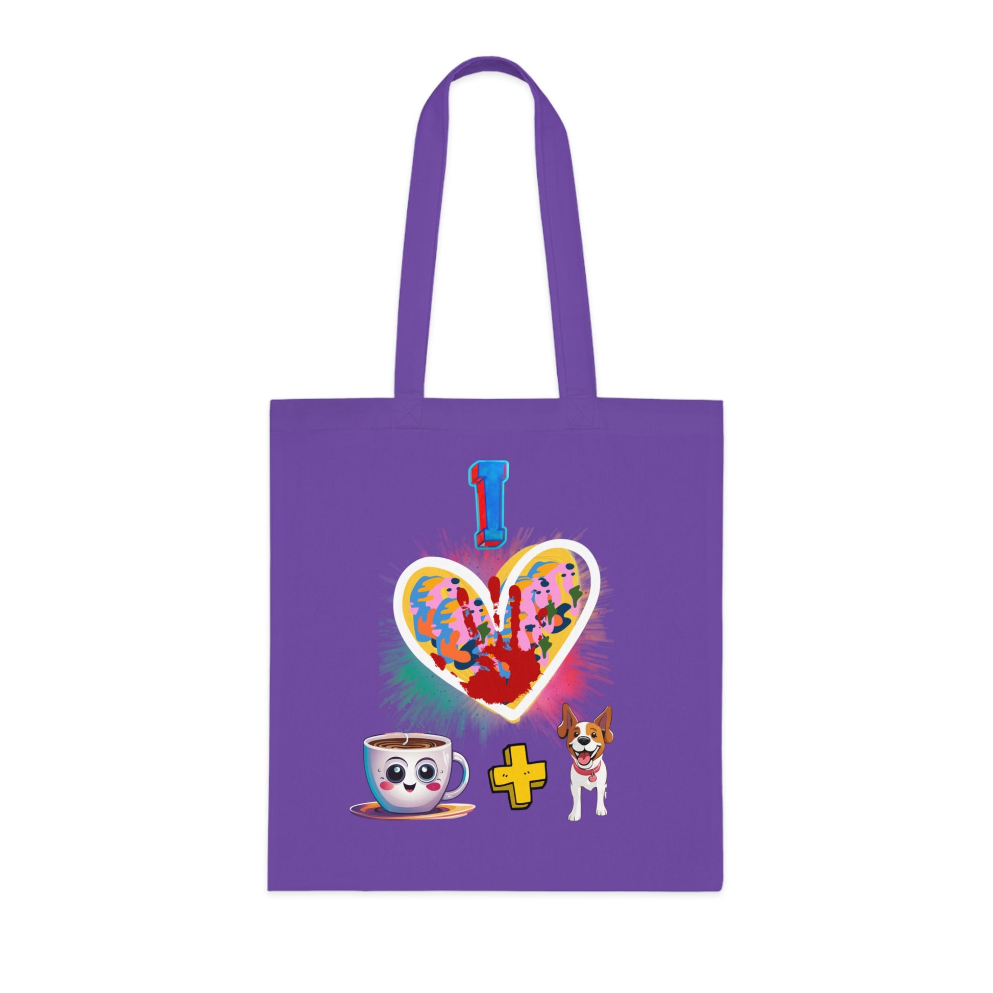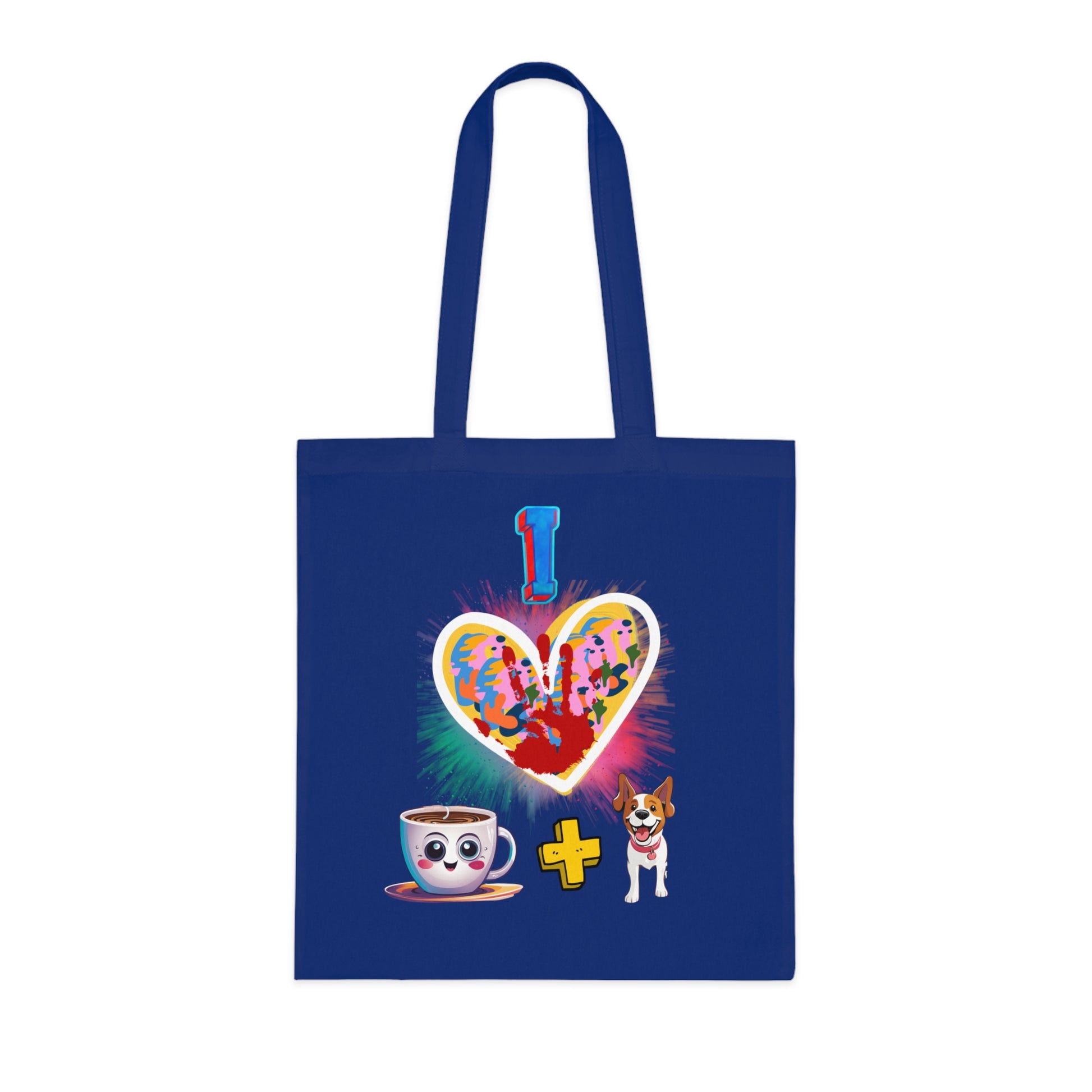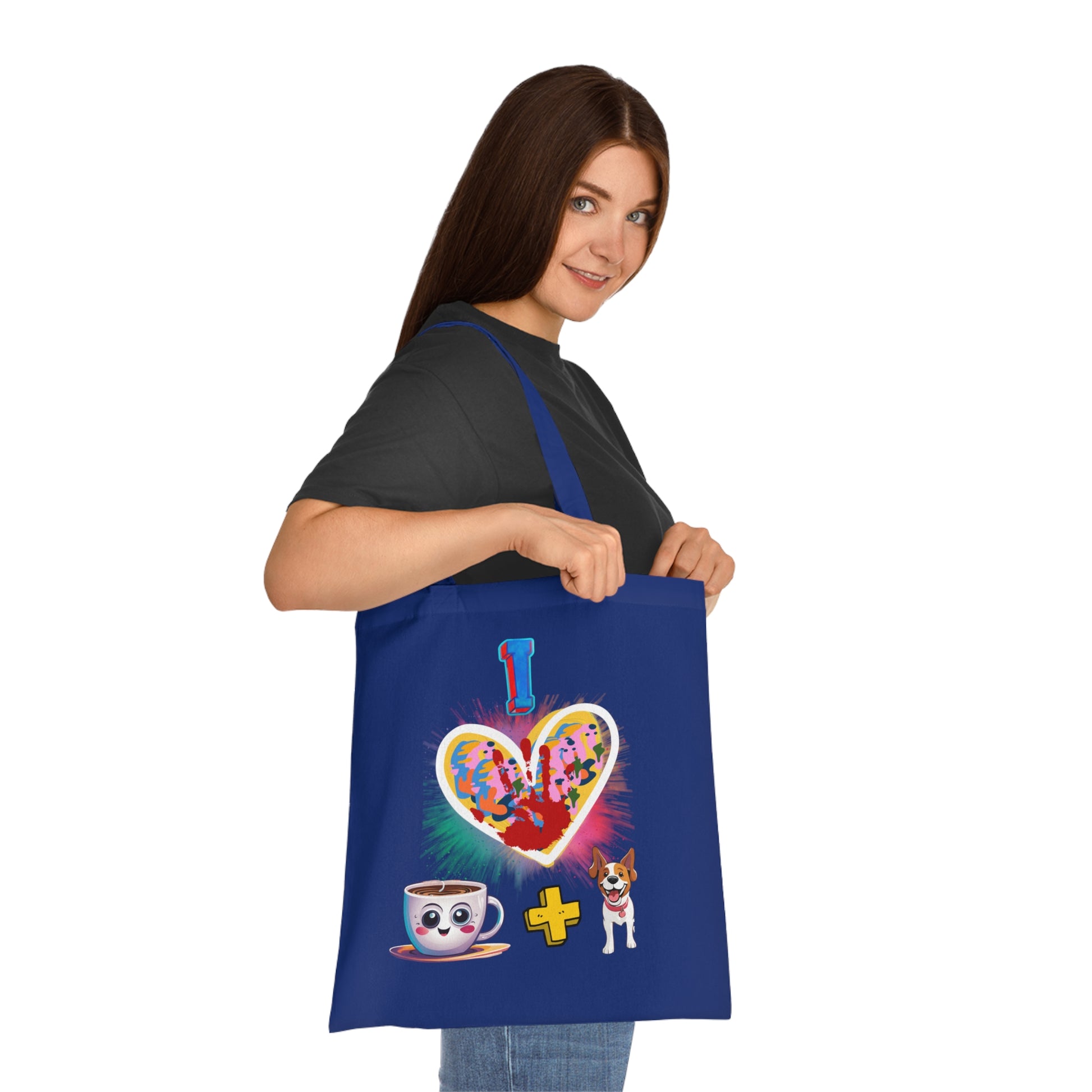 This cotton tote features a colorful design of a coffee cup next to a dog with an 'I love' message and a heart symbol, perfect for coffee and dog lovers. It's a lightweight and versatile accessory that can elevate any outfit and show off your personality. This tote is ideal for people who enjoy coffee, have a pet dog, and appreciate vibrant and fun designs. It's perfect for everyday use, shopping, or as a gift for birthdays, holidays, or any occasion.